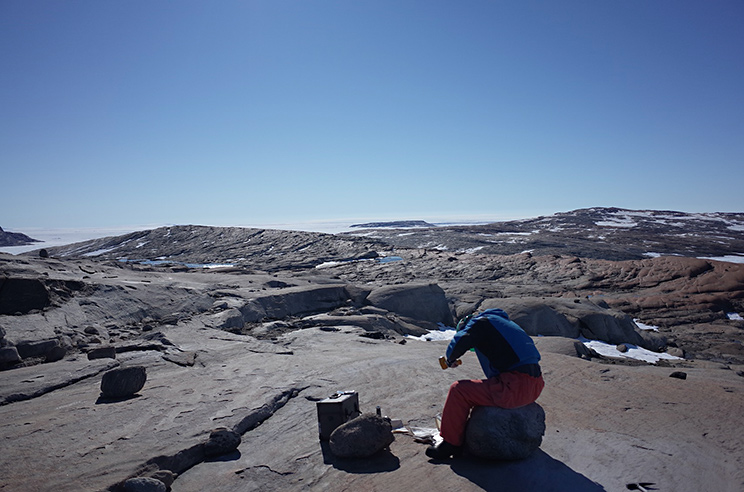スカーレンでの岩石サンプリングの様子。氷河擦痕と迷子石が確認できる。擦痕の方向は,写真左下から右上の方向に伸びているため、この方向に氷河が流動していたと考えられる。